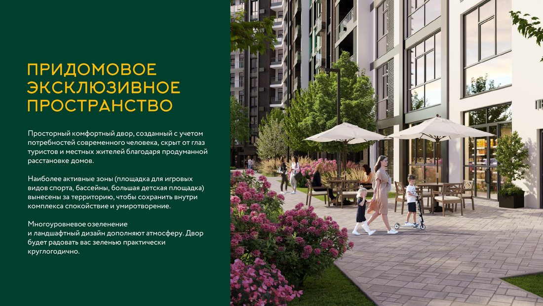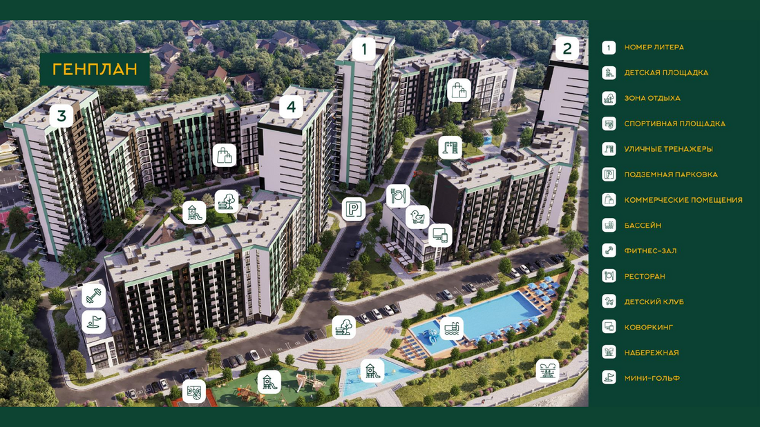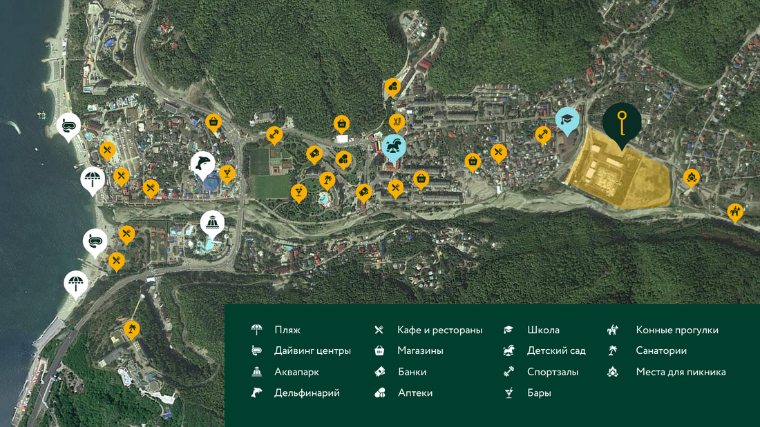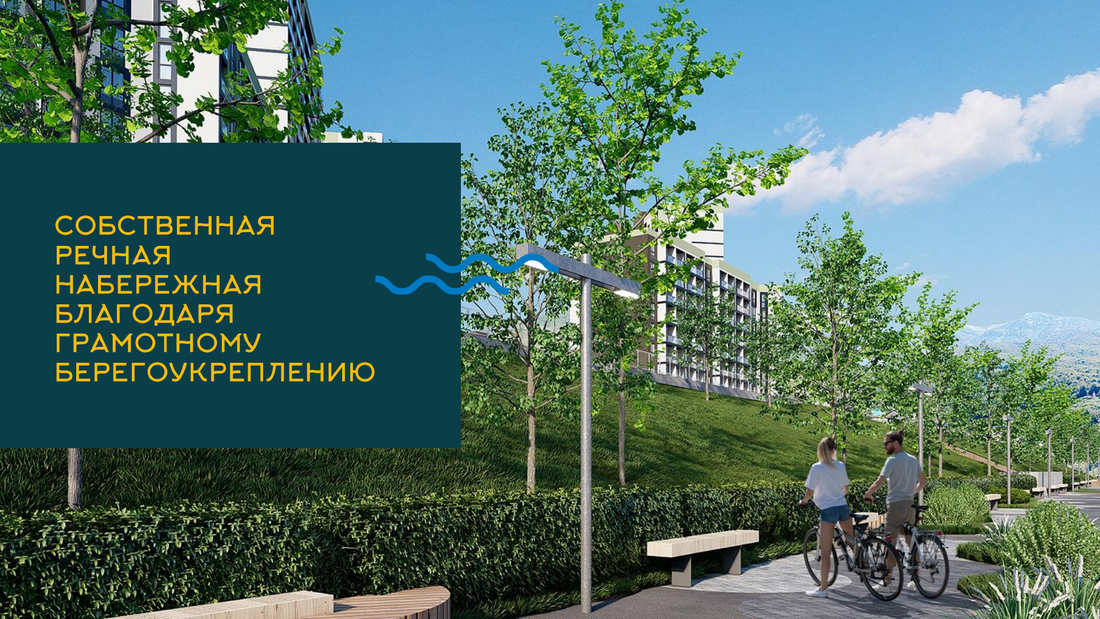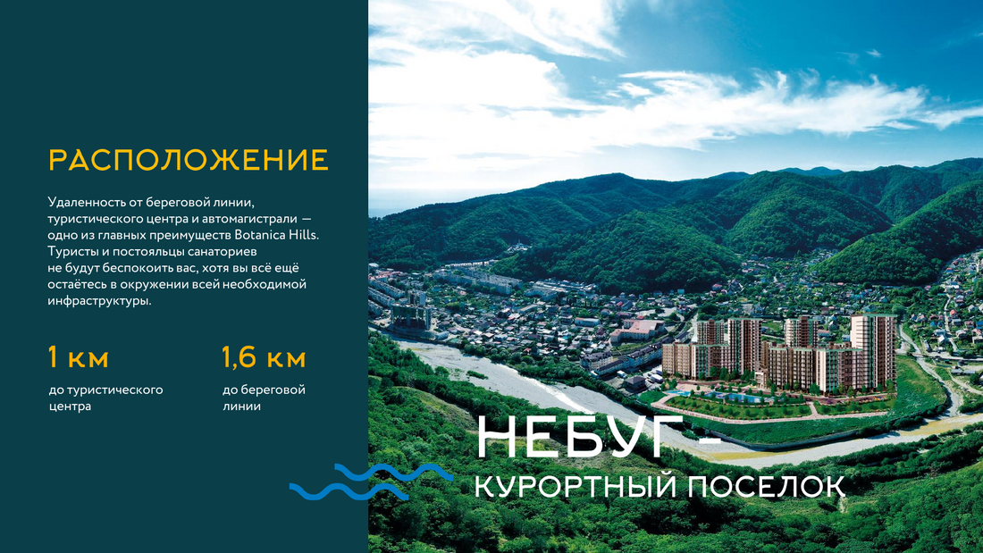 Жилой комплекс расположен в живописном месте на берегу реки Небуг, из окон открываются потрясающие виды на реку и горы. Резиденция предлагает своим жителям разнообразные удобства: открытые бассейны, спортивные и детские площадки, а также широкий спектр услуг прямо на территории комплекса, включая химчистку, аптеку, фитнес-зал, СПА-центр, продуктовые магазины и многие другие, создавая комфортную и самодостаточную среду проживания.